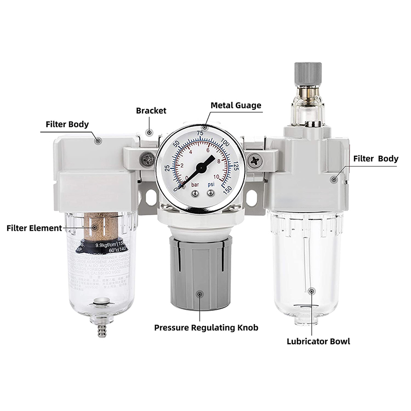 The Filter, Regulator&Lubricator is three part system. The filter is designed to remove most liquid and solid particles from the air supply. The Self-Relieving Pressure Regulator is used to adjust the outlet pressure. The lubricator provide oil to the air tool and increase the life of the tool.