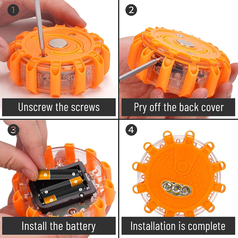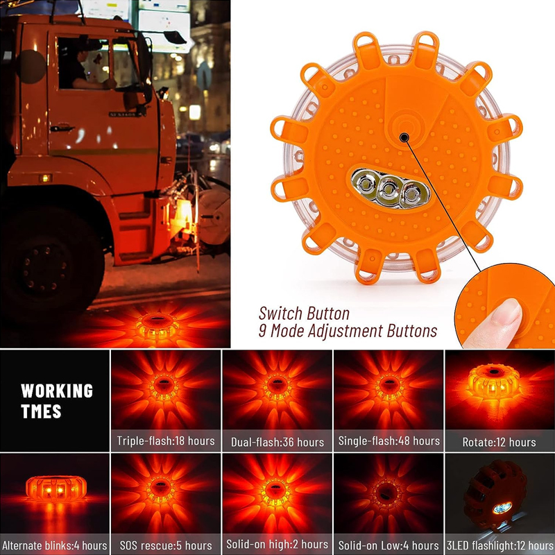 - ✅ 9 Different Flashing Modes: Each LED Safety flare light has 9 flashing modes fast flash, slow flash, single flash, rotating flash, alternating flash, SOS, 3 led white light on top for different SOS rescue signals both for marine and road emergency use. It can be seen up to 1 mile at night and radiate outward 360 degrees to warn other drivers on the road to slow down and approach safely