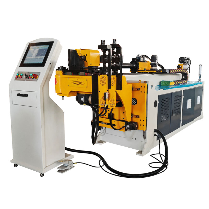 This CNC bending machine features a touch screen display and computer-controlled operation, capable of storing 200 memory groups. It provides real-time error messages on the screen to assist operators in troubleshooting quickly. The feeding and rotation angles are servo-controlled, while the elbow is managed by an oil cylinder. Additionally, the machine includes slow bending and slow core-pulling functions for improved precision and control during complex bending operations.