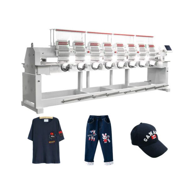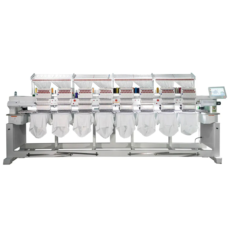 8 heads embroidery machine features 9/12/15 needles and an embroidery speed up to 8*1000SPM, which can satisfy the mass production requirements. Application: suitable for caps, tshirts, garments, pants, pocket, bag, shoes, tablecloth, various thickness of fabric and leather etc.