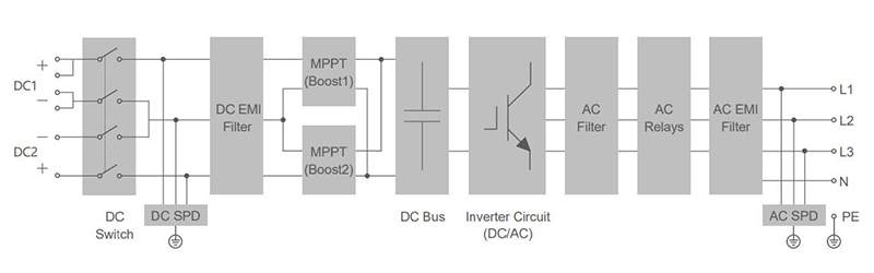 | Max. PV input current | 25A(12.5A/12.5A) | 25A(12.5A/12.5A) | 37.5A(25A/12.5A) | 37.5A(25A/12.5A) | 37.5A(25A/12.5A) | 37.5A(25A/12.5A) |