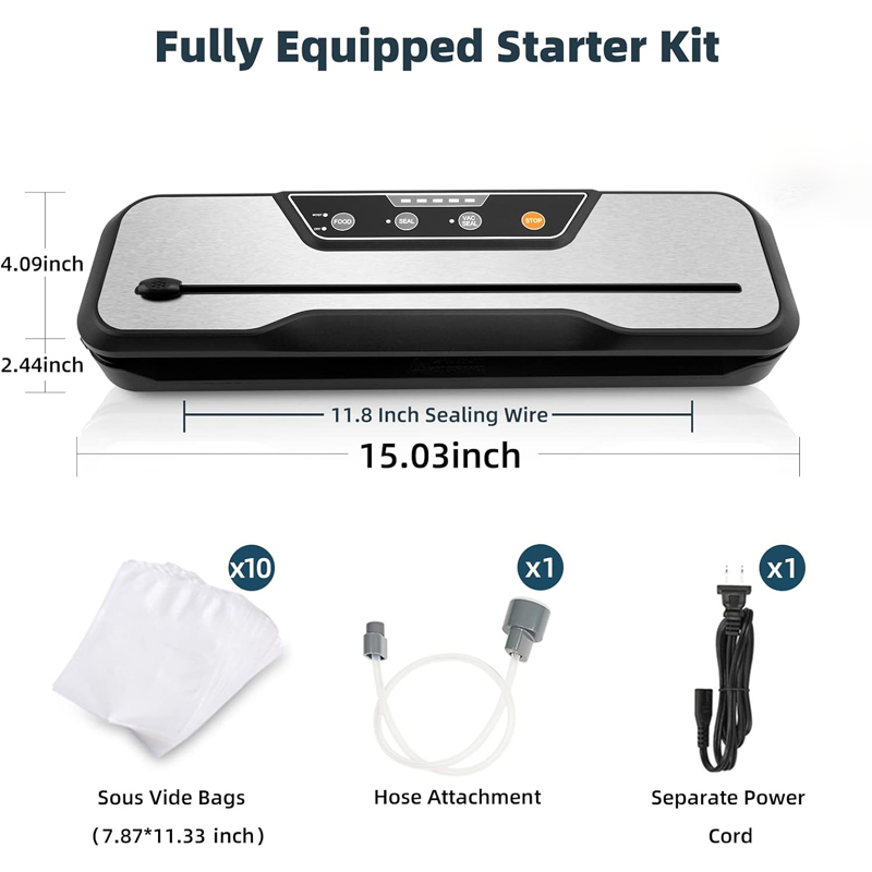 - 【Built-in Cutter for Roll Bag】— Surface bag cutter design, according to your needs to create custom size bags within few seconds. Use stainless steel panel, durable and strong, the vacuum sealer is equipped with 4 physical buttons operation and LED indicator light.
